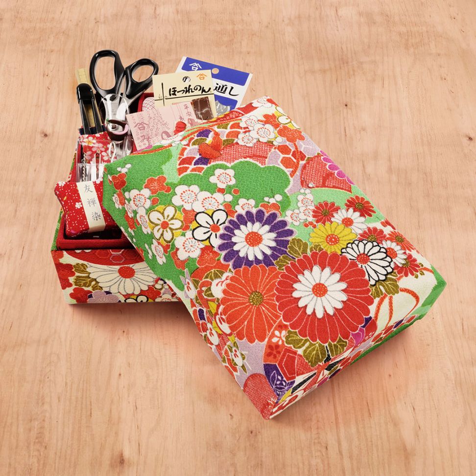 華やかな着物柄の京ちりめんを使用したお裁縫箱に針しごとに必要な道具を揃えました。